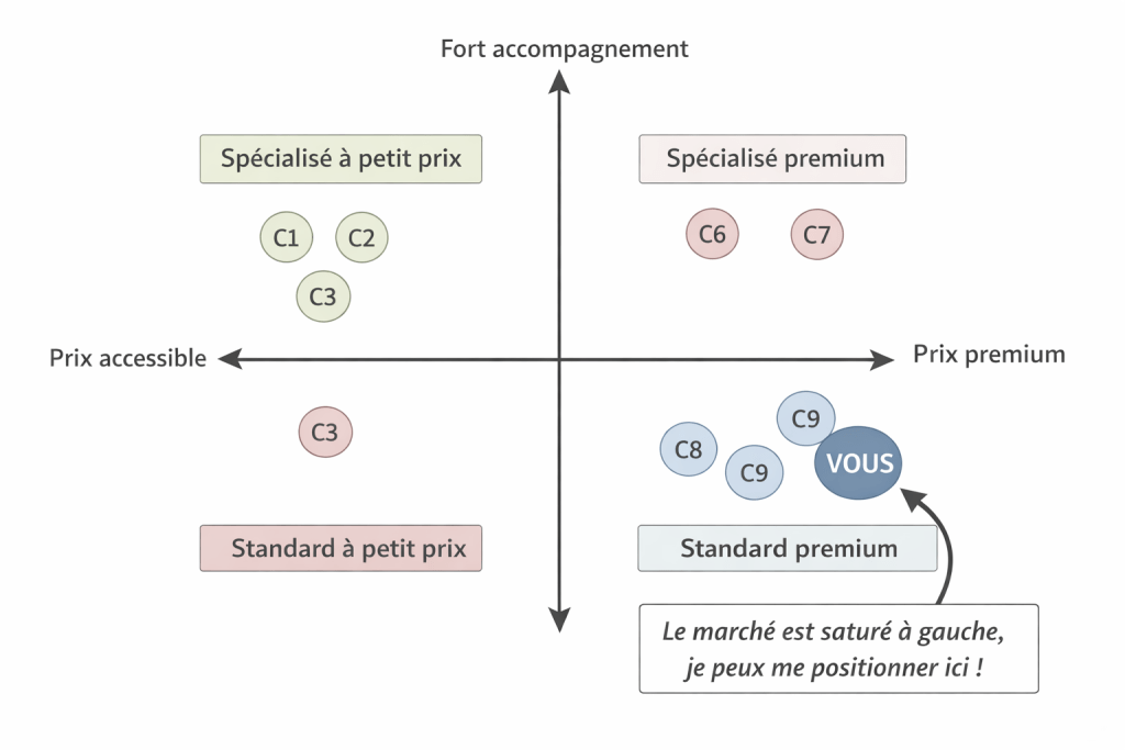 Le mapping vous donne une photo simple du marché. Vous placez les offres sur deux axes. Ensuite, vous repérez les zones déjà saturées, et les zones plus ouvertes.